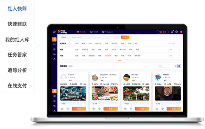 Halobuddy红人营销平台 网罗全球海量红人资源,一站式开启红人合作 即刻试用 海外红人营销服务常见4大困境 01缺乏高质量的红人合作资源和沟通联系渠道 02需要通过第三方代理机构与红人建立联系,无法长期合作 03红人合作项目管理周期长急需智能化的任务追踪平台 04红人营销效果不佳,需要获取相关数据分析,进行营销策略调整 客户痛点: 海外红人营销业务场景中的多元化需求 常遇到哪些问题 客户通过第三方接触红人? 无法一站式完成全套营销服务缺乏项目数据指标参考仅提供有限的KOL名单和选择网红合作流程不规范 客户希望 怎样选择红人与品牌合作? 选择多个目标社媒平台的红人选择与品牌调性匹配的红人选择粉丝互动率稳定的红人根据目标市场匹配本土红人即刻试用 找红人,选Halobuddy! 六大功能,一站式为您提供网红合作服务 红人快筛精准锁定营销目标, 根据兴趣标签快速搜索适合您品牌的红人 快速建联在线开聊,简化与红人建联流程,提升合作效率 我的红人库多维度管理红人,建立长期的红人合作关系 任务管家一键创建红人任务,全流程高效协助您管理项目 追踪分析评估与红人合作的营销效果,衡量投入回报率 在线支付合作结束后,通过平台快速为红人进行批量结算,提升支付效率 我们的红人资源 3000W+全球红人资源 聚合 3,000M+全球受众 覆盖 30+全球服务行业 触达 专业实力 成就行业口碑 助力20,000+企业、30,000+款产品扬帆出海